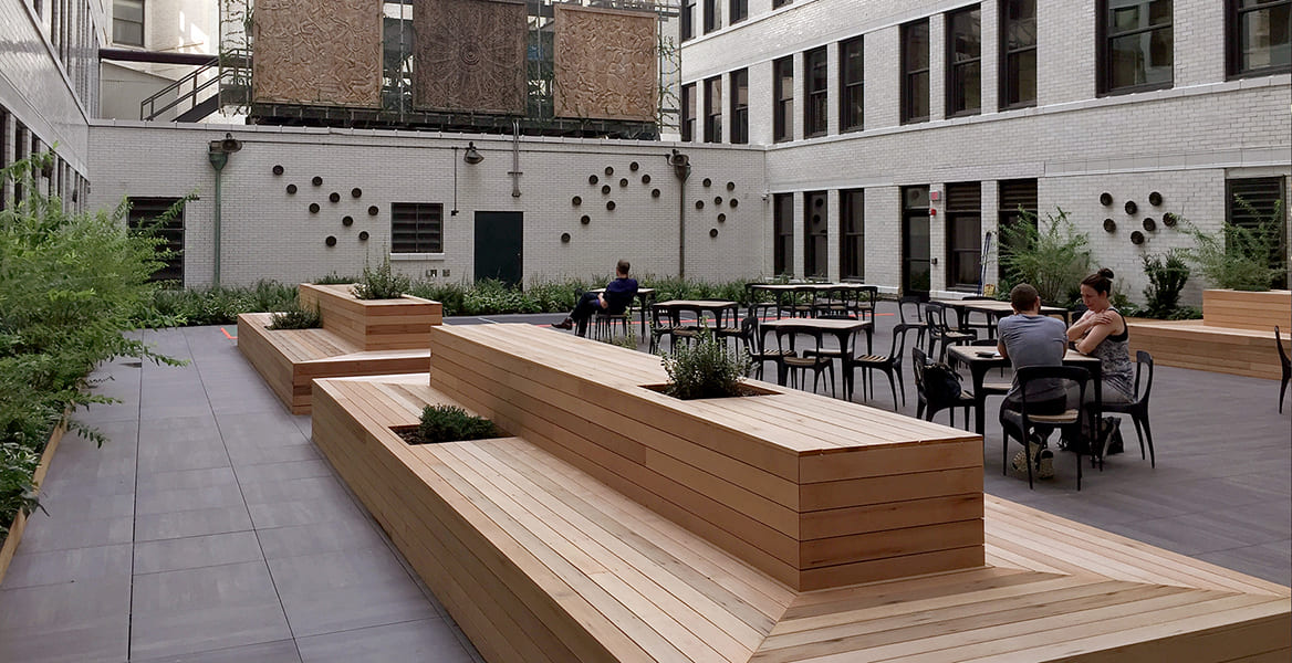 Originally designed by D.H. Burnham & Co. in 1907, a 1950’s era modernization significantly altered the ground floor entries and lobbies and eliminated all historic elements at the building’s ground floor and upper-level spaces. Through renovations that included both interior spaces and the terra-cotta façade, the ground floor of the building has been transformed into an innovative culinary market, while upper floors of the building now accommodate co-working spaces and a shared light well roof deck, repurposed as a garden terrace. Historically protected elements included 1950s-era lobbies, which have been restored to their original finish and luster, and earlier, original features have been revealed and repaired.
