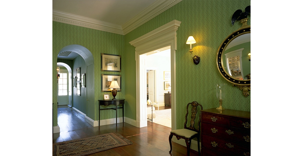 This house was designed to reflect the Owners' love of Georgian architecture. The inspiration is derived from eighteenth century houses of the eastern seaboard. A graveled fore-court establishes a formal tone for the entrance facade, while a stone terrace presents a more relaxed, though elegant, connection to the garden. The house is really a collection of buildings such as might have developed over time. Materials, details, and scale are varied between the parts and are used to establish a hierarchy for the different elements. The formality of the composition is countered by the warmth of the materials: brick, clapboard, and cedar shingles.